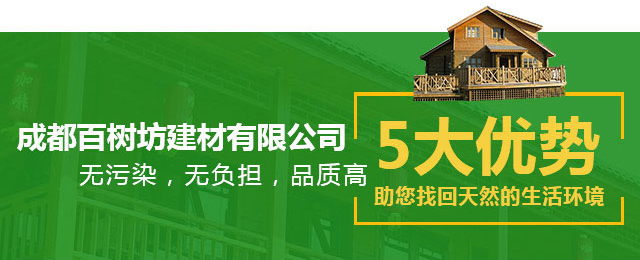 成都百樹坊建材有限公司是專業從事防腐木屋、防腐木涼亭、等節能環保建筑,是一家集生產、銷售、施工與服務為一體的企業。我公司專業生產高品質的國內外優質防腐木材。從之前的藥物防腐到今天的抗防腐均作出很大努力,也是較早引進純外實木地板的企業之一。